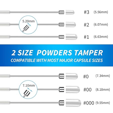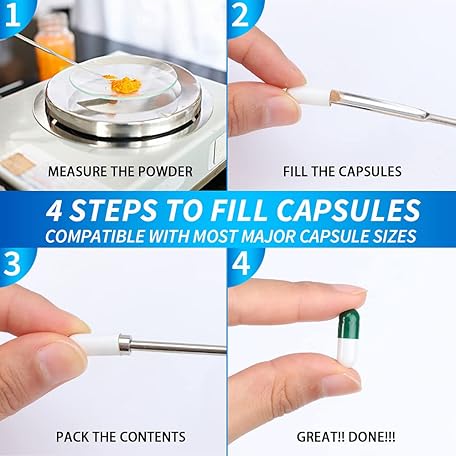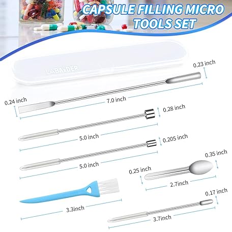 Thông tin sản phẩm Capsule Filling Machine Tools Capsule Filler Pill Maker - Micro Spoon Spatula/Mini Powder Herb Tamper/Lab Micro Scoop/Clean Brush & Storage Case, Fit Empty Capsules Sizes #000 00 0 1 2 3