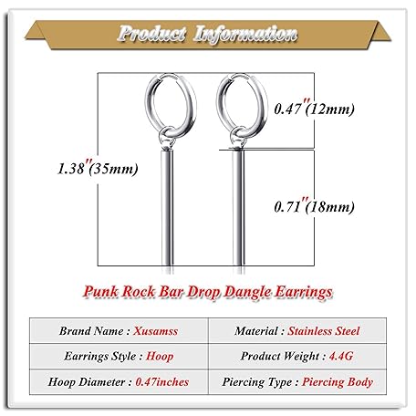 Sản phẩm Xusamss Punk Jewelry Stainless Steel Huggie Hinged Earrings Bar Dangle Drop Earrings đang được bán với giá ưu đãi là $10.6275 tại nước Mỹ.
