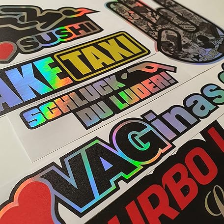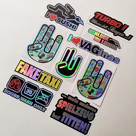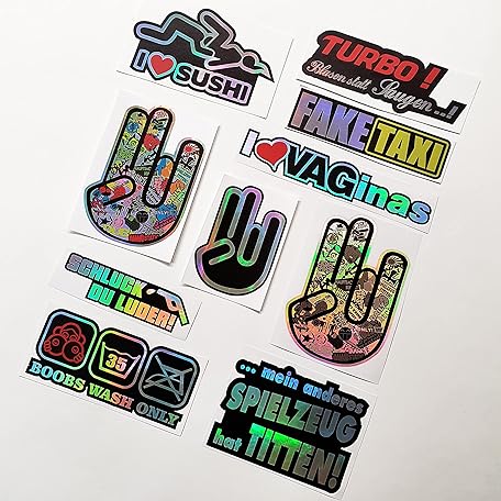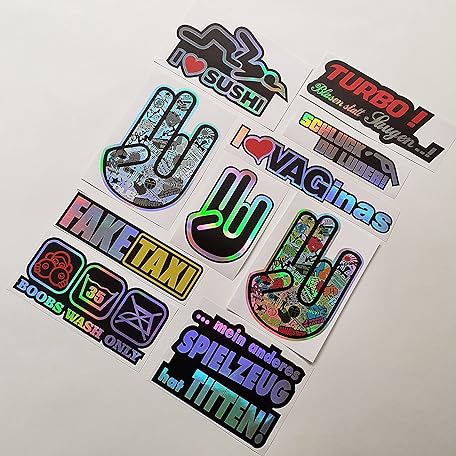 Sản phẩm 10 Car Sticker Set Schluck du Leder Fake Taxi Shocker Hand Sticker Bomb Turbo Boobies I Love Sushi JDM Tuning Black Hologram Oilslick Rainbow Flip Flop Metallic Effect đang được bán với giá ưu đãi là $41.2783 tại nước Đức.