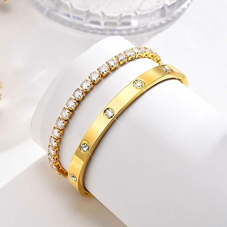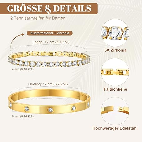 Thông tin sản phẩm 2 Stück Armreif Gold 17/18/19cm, Armband Damen Set für Frauen Mädchen, 18K Vergoldet Armbänder aus Edelstahl mit Kristallen, Tennisarmband Gold mit Zirkonia aus Kupfer für Mutter Ehefrau Freundin