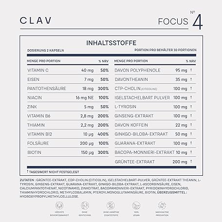 Thương hiệu CLAV là cái tên nổi tiếng được rất nhiều khách hàng trên thế giới chọn lựa. Với kiểu dáng đẹp mắt, sang trọng, sản phẩm 2 x N°4 Focus - Nootropika Brain Booster with CDP Choline (Citicolin) + Ginko Biloba + Brahmi Extract + Vitamin B Complex - Increase Concentration + Brain Performance - 120 Memory Capsules - Vegan là sự lựa chọn hoàn hảo nếu bạn đang tìm mua một món cho riêng mình.