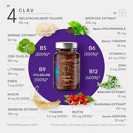 Sản phẩm 2 x N°4 Focus - Nootropika Brain Booster with CDP Choline (Citicolin) + Ginko Biloba + Brahmi Extract + Vitamin B Complex - Increase Concentration + Brain Performance - 120 Memory Capsules - Vegan đang được bán với giá ưu đãi là $81.7609 tại nước Đức.
