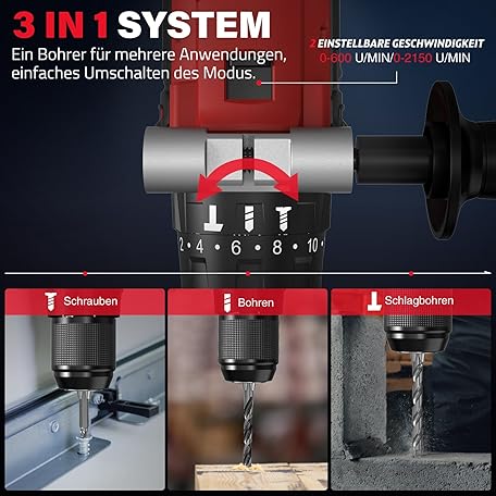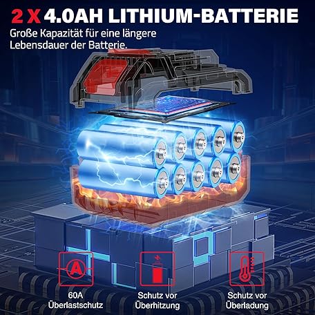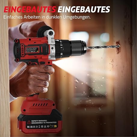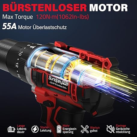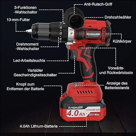 Thông tin sản phẩm 21 V Cordless Screwdriver with Hammer Drill Function - SundpeyPRO 120 Nm Brushless Cordless Drill Set with 2 x 4000 mAh Batteries, 20 + 3 Torque Levels Cordless Drill, 13 mm Drill Chuck, 2-Gear, LED
