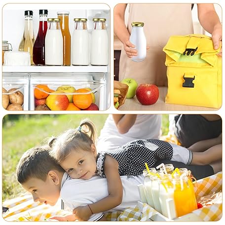 Thông tin sản phẩm 4 Glass Milk Bottles 330 ml, Glass Bottles for Filling with Funnel, Label, Straw and Brush, Reusable Smoothie Bottle for Juices, Syrups, Sauces, Smoothies and Sauces (Gold Lid)