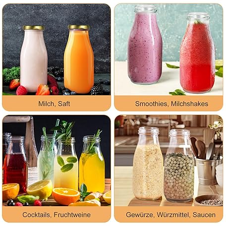 Sản phẩm 4 Glass Milk Bottles 330 ml, Glass Bottles for Filling with Funnel, Label, Straw and Brush, Reusable Smoothie Bottle for Juices, Syrups, Sauces, Smoothies and Sauces (Gold Lid) đang được bán với giá ưu đãi là $16.5135 tại nước Đức.