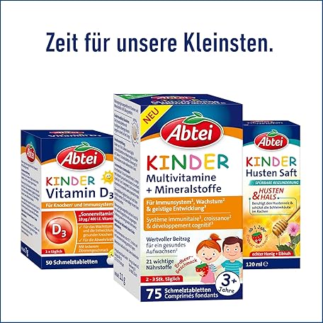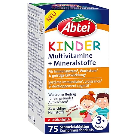 Sản phẩm Abtei Kinder Multivitamine + Mineralstoffe - Für ein gesundes Aufwachsen* von Kindern - Ab 3 Jahren - Mit 21 wichtigen Nährstoffen - Glutenfrei, Laktosefrei, Gelatinefrei - 75 Schmelztabletten đang được bán với giá ưu đãi là $6.2566 tại nước Đức.