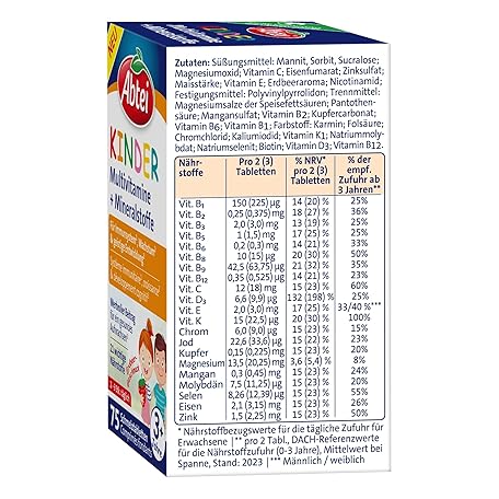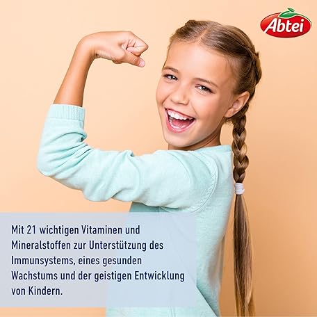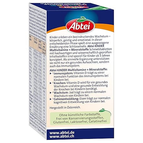 Thông tin sản phẩm Abtei Kinder Multivitamine + Mineralstoffe - Für ein gesundes Aufwachsen* von Kindern - Ab 3 Jahren - Mit 21 wichtigen Nährstoffen - Glutenfrei, Laktosefrei, Gelatinefrei - 75 Schmelztabletten