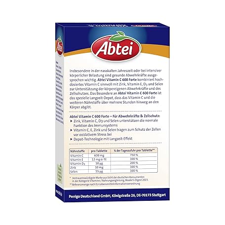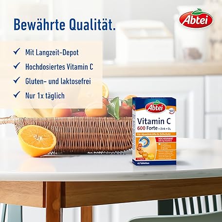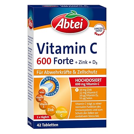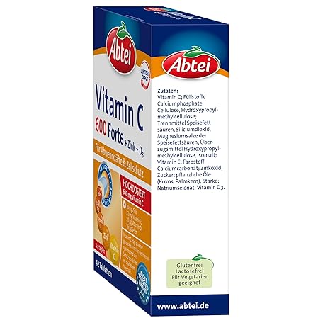 Sản phẩm Abtei Vitamin C 600 Forte with Zinc and Vitamin D3 - for Defences and Cell Protection - High Dose, Gluten-Free, Lactose-Free, Laboratory Tested - 42 Tablets đang được bán với giá ưu đãi là $6.8779 tại nước Đức.