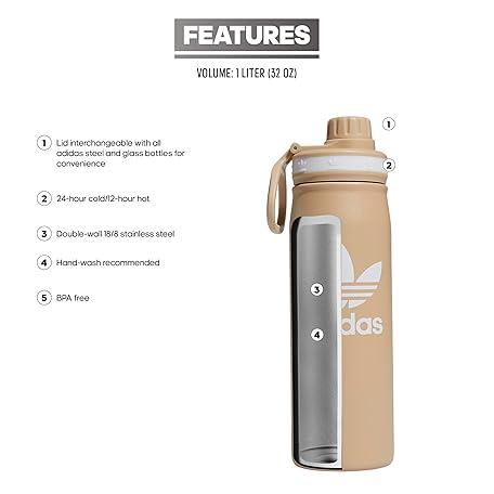Thông tin sản phẩm adidas Originals 600 ml (20 oz) Metal Water Bottle, Hot/Cold Double-Walled Insulated 18/8 Stainless Steel, Magic Beige/White, One Size
