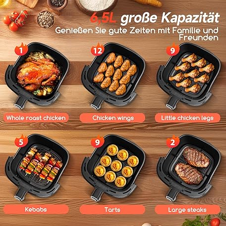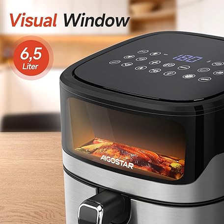 Thông tin sản phẩm Aigostar Air Fryer Hot Air Fryer with Visible Window, 6.5 L XXL, 1600 W, 10 Preset Menus, Intelligent Preheating, Defrosting, DIY, Independent Light Control, Balloon