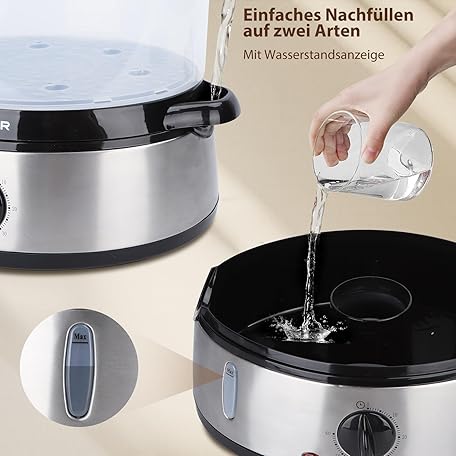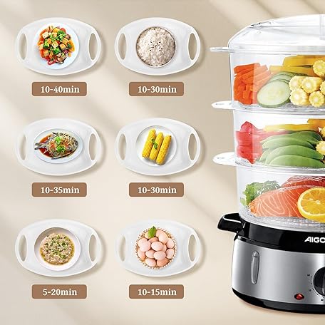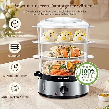 Thông tin sản phẩm Aigostar Steamer with Timer 9 L, 3 Tier Stacking Baskets, Rice Bowl, 800 W Electric Steamer, Automatic Shut-Off, Stainless Steel, BPA-Free, Silver/Black, Disposable Packaging