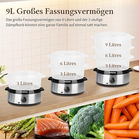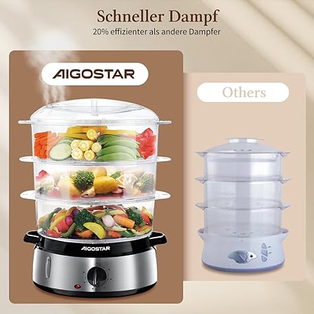 Sản phẩm Aigostar Steamer with Timer 9 L, 3 Tier Stacking Baskets, Rice Bowl, 800 W Electric Steamer, Automatic Shut-Off, Stainless Steel, BPA-Free, Silver/Black, Disposable Packaging đang được bán với giá ưu đãi là $44.4938 tại nước Đức.