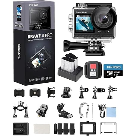 Thông tin sản phẩm AKASO Brave 4 Pro Action Cam 4K30FPS 20MP with 128GB U3 Memory Card 40M Underwater Camera Ultra HD Touchscreen 170° Wide Angle Ice Stabilisation 5X Zoom, 2.4G Remote Control and 2 Batteries 1350mAh