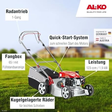 Thông tin sản phẩm AL-KO Classic 4.62 SP-A Petrol Lawnmower, 46 cm Cutting Width, 1.9 kW Engine Power, 1-Speed Wheel Drive, for Lawns up to 1400 m²