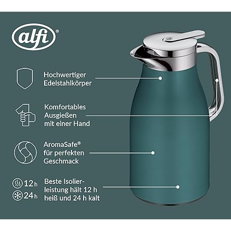 Thông tin sản phẩm alfi Skyline Thermos Jug, Stainless Steel Jug in Turquoise Colour, 1 Litre Jug with Double-Walled AlfiDur Vacuum Tempered Glass Insert alfi 1321.293.100 Insulated Jug Keeps Drinks Hot for 12 Hours, Suitable as a Coffee Pot or Teapot