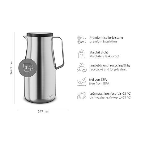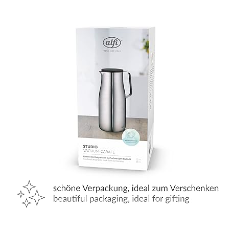 Thông tin sản phẩm alfi STUDIO TT 1.5 L, Stainless Steel, Insulated Jug Made of Double-Walled Matte Stainless Steel, Keeps Warm for 12 Hours, Cold for 24 Hours, Screw Cap, Large Opening, Thermos Flask, Dishwasher Safe,