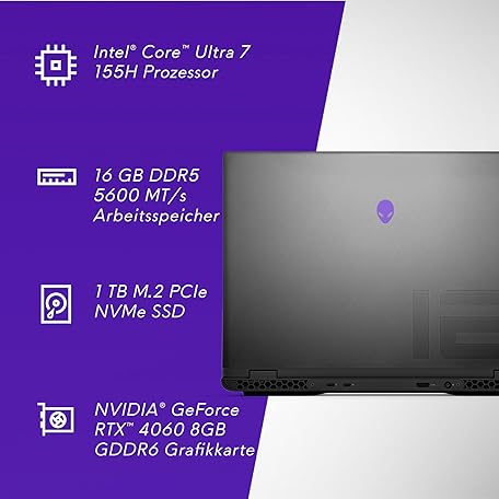 Thông tin sản phẩm Alienware m16 R2 Gaming Laptop - 16 Inch QHD+ 240Hz, Intel Core Ultra 7 Series 1, 16GB RAM, 1TB SSD, NVIDIA GeForce RTX 4060, Windows 11 Home, German AlienFX Keyboard - Dark Metallic Moon