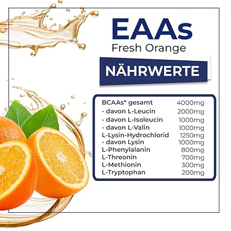 Thông tin sản phẩm All Stars EAA Powder Fresh Orange I Amino Acids High Dose I 420 g Powder with 10,000 mg EAAs per Serving I BCAA Supplement with L-Leucine + L-Valine + L-Isoleucine I Shake Sugar-Free