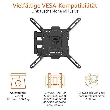 Sản phẩm Amazon Basics Black Swivel Tilting TV Bracket for 26" - 55" Curved & Flat TV or Monitor up to 80lbs (36kg) Max VESA 400x400mm đang được bán với giá ưu đãi là $41.3001 tại nước Đức.