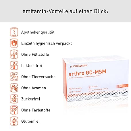 Thương hiệu amitamin là cái tên nổi tiếng được rất nhiều khách hàng trên thế giới chọn lựa. Với kiểu dáng đẹp mắt, sang trọng, sản phẩm amitamin arthro GC MSM Glucosamine & Chondroitin & MSM Plus Vitamin C | 120 Capsules | Pharmacy Quality | Individually Hygienically Packed | No Unnecessary Additives | Made in Germany là sự lựa chọn hoàn hảo nếu bạn đang tìm mua một món cho riêng mình.