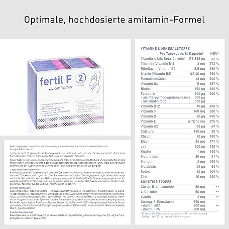 Thông tin sản phẩm amitamin Fertil F Phase 2, 120 Capsules, for Pregnancy and Breastfeeding, Premium Complex Formula of Folate, Folic Acid, Omega-3 Fatty Acids DHA and EPA and 24 Micronutrients