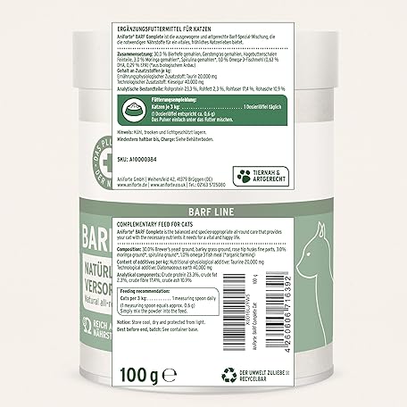 Sản phẩm AniForte Barf Complete Cat 100 g - Natural All-Round Supply with Omega 3, Brewer's Yeast, Taurine, Rose Hip, Premium Food Additive for Barf, Vitamins and Minerals đang được bán với giá ưu đãi là $25.5823 tại nước Đức.