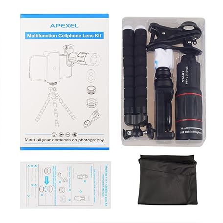 Sản phẩm APEXEL Camera Lens Kit,18x Monocular Telescope with Eyecup,0.63x Wide lens&15x Macro Lens,198°Fisheye Lens,Flexible Camera Tripod with Remote Shutter for iPhone Samsung and huawei and most Smartphone đang được bán với giá ưu đãi là $32.8744 tại nước Đức.