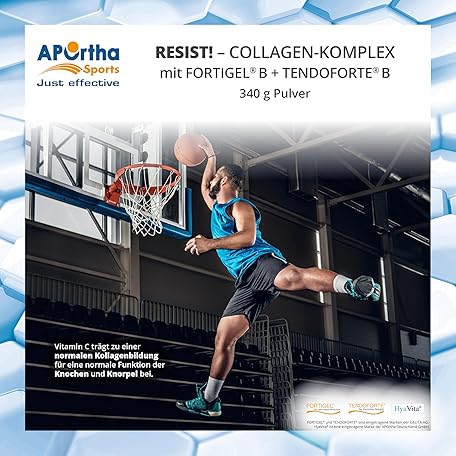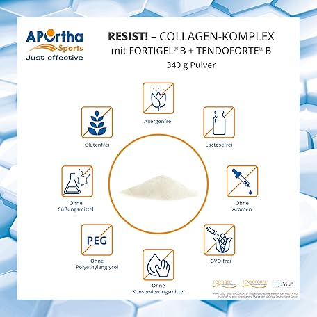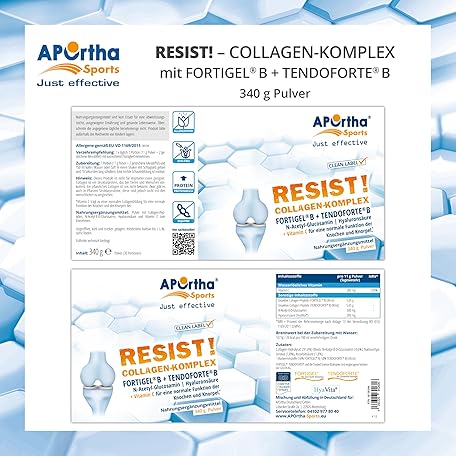 Thông tin sản phẩm APOrtha Sports Resist! Nutrient Complex with Fortigel® + Tendoforte - 340 g Powder, Innovative, Bioactive Collagen Peptides with Glucosamine and Hyaluronic Acid, Gluten-Free, Allergy-Free,