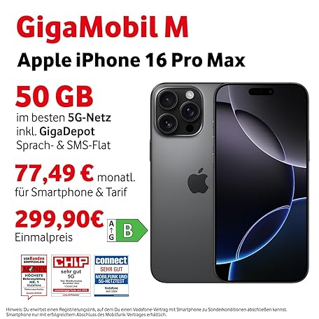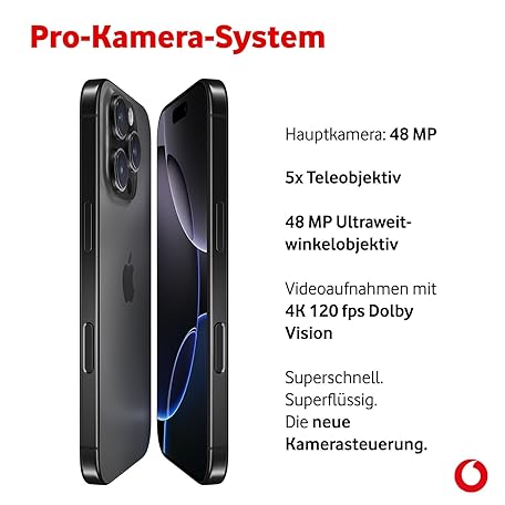 Thương hiệu Vodafone là cái tên nổi tiếng được rất nhiều khách hàng trên thế giới chọn lựa. Với kiểu dáng đẹp mắt, sang trọng, sản phẩm Apple iPhone 16 Pro Max mit Vodafone Vertrag | Aktion: 25% Basispreis-Rabatt | 24 Mon. Laufzeit | in Titan Schwarz | mit 256 GB Speicher là sự lựa chọn hoàn hảo nếu bạn đang tìm mua một món cho riêng mình.