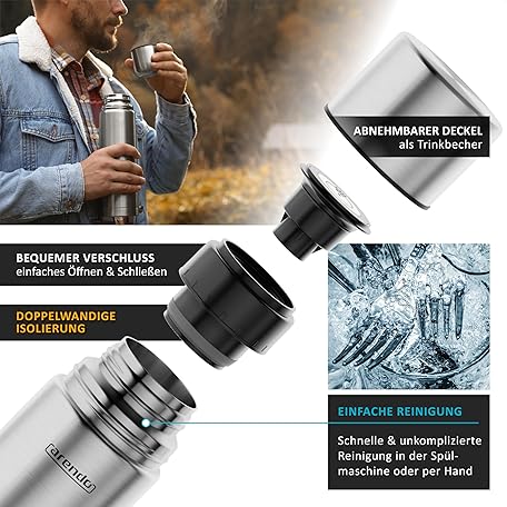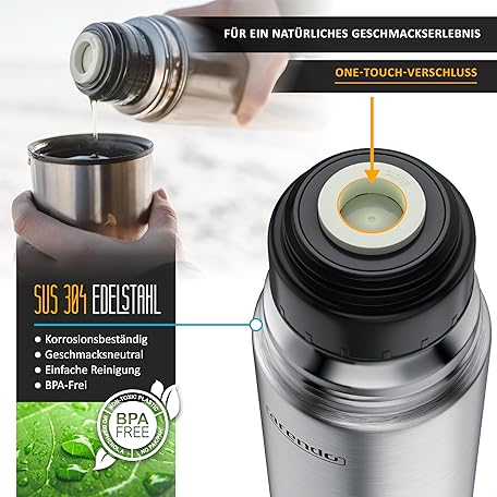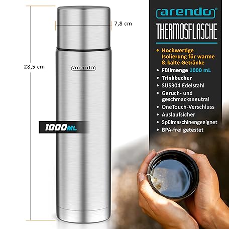 Sản phẩm Arendo - Thermoskanne 1l – Edelstahl Thermosflasche mit Deckel doppelwand – 1000 ml – 100% auslaufsicher - spülmaschinenfest - Trinkflasche für Heiß- und Kaltgetränke đang được bán với giá ưu đãi là $25.0046 tại nước Đức.
