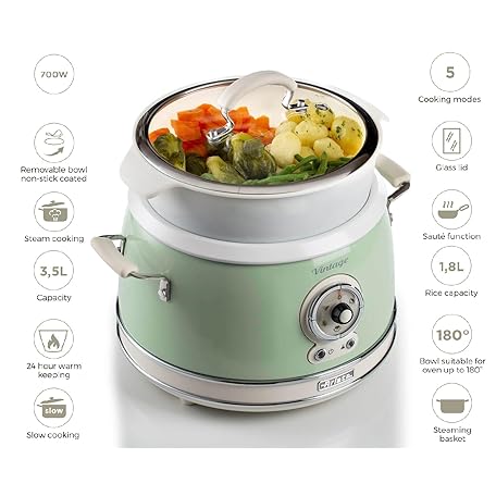 Sản phẩm Ariete 2904 Rice Cooker Slow Cooker Steamer Vintage Line 3.5L Non Stick Ceramic Coating 650W Green đang được bán với giá ưu đãi là $87.1346 tại nước Đức.