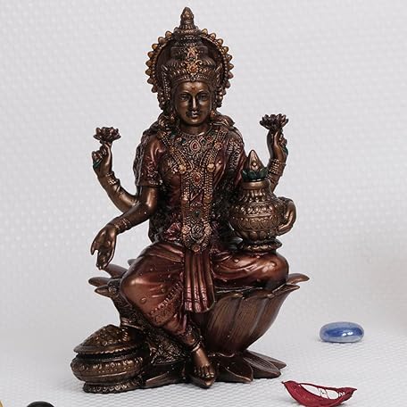 ARTVARKO Göttin Laxmi Murti Lakshmi Kaltgussharz Bronze-Finish Idol Luxmi sitzend auf Lotus-Statue für Heimdekoration, Puja Mandir Tempel, 17,8 cm