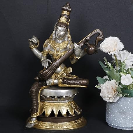 ARTVARKO Göttin Saraswati Murti Saraswati Idol Messing Statue für Hauseingang Viel Glück Vastu Dekoration Schaustück und Geschenk Höhe 30,5 cm