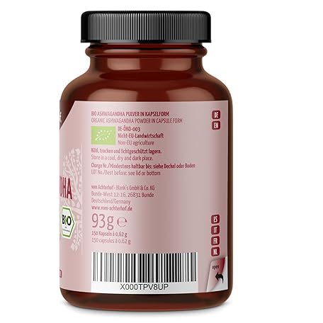 Sản phẩm Ashwagandha Capsules Organic Pack of 150 | High Dose 1500 mg per Daily Dose | Finely Ground Ashwagandha Powder in Organic Quality | Important Role in Indian Ayurveda | from Achterhof đang được bán với giá ưu đãi là $21.5166 tại nước Đức.
