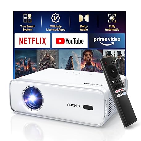 Aurzen Eazze D1 Smart Projector Home Cinema Projector 4K Supports Full HD 1080P Projector with NetfIix Official & DoIby Audio, Auto Focus & Trapezoidal Correction, Mini WiFi Bluetooth Video Projector