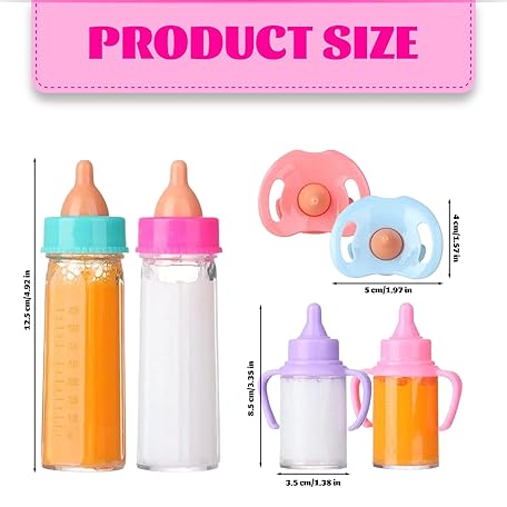 Thông tin sản phẩm Baby Doll Bottles with Pacifiers, 6 Pcs/Set, Simulated Baby Bottles for Dolls with Vanishing Milk or Juice, Role Play Accessories, Gift for Kids, Baby Doll Bottles with Different