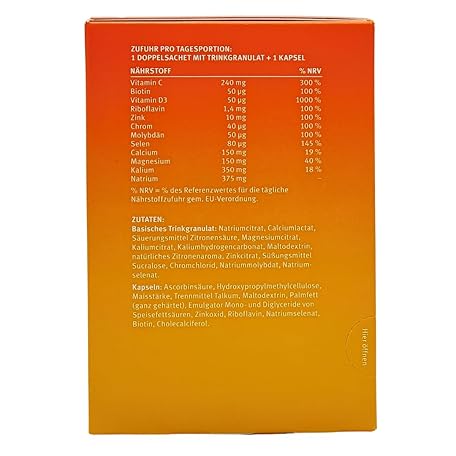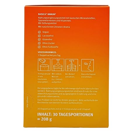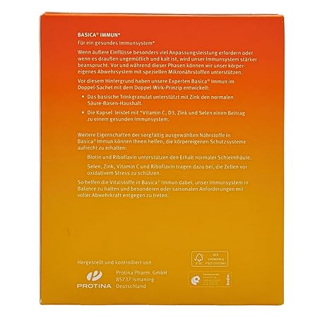 Thông tin sản phẩm Basica Immune 1 x 30 Double Sachets I Drinking Granules + Capsule I for the Acid-Base Balance I Vitamin C, Zinc, Selenium, Vitamin D I for the Body's Immune System I Economy Set Plus Pharma Perle