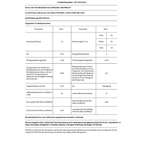Thông tin sản phẩm Bauknecht B2F HD624 A Freestanding Dishwasher, 60 cm, 14 Place Settings, Hygiene Programme, Full Water Protection, Start Time Delay