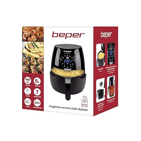 Thông tin sản phẩm BEPER P101FRI050 Hot Air Fryer, Oil Free, 5 Litres, Touchpad, 7 Preset Programmes, Dimmable up to 200°C, Timer 60 Minutes, Automatic Shut-Off, Black