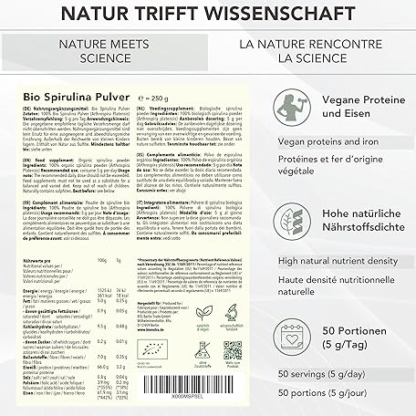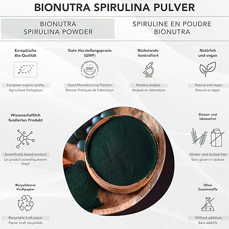 Thông tin sản phẩm BIONUTRA® Bio Spirulina Pulver 250 g, rückstandskontrolliert, nach EU-ÖKO-Standard hergestellt, vegan, laktose- & glutenfrei, ohne Zusätze, Spirulina Pulver Bio