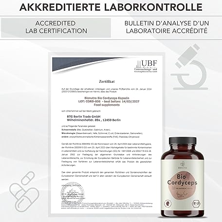 Thông tin sản phẩm BIONUTRA® Organic Cordyceps Capsules High Dose, 1200 mg Daily Dose, Residue Controlled, German Production, Vegan, No Additives, Caterpillar Fungus Cordyceps Organic, 180 Pieces x 600 mg