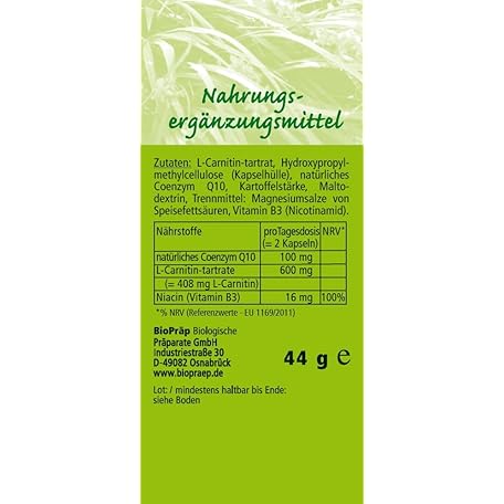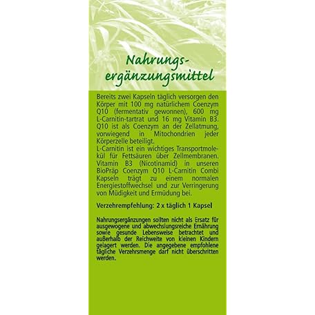 Thông tin sản phẩm BioPräp Coenzyme Q10 L-Carnitine Combi Capsules, 90 Cellulose Capsules, Vegan, Produced in Germany, Certified Production