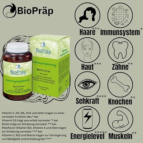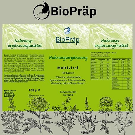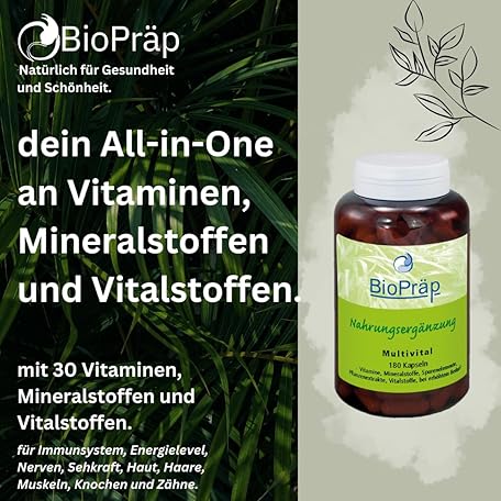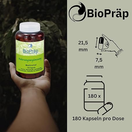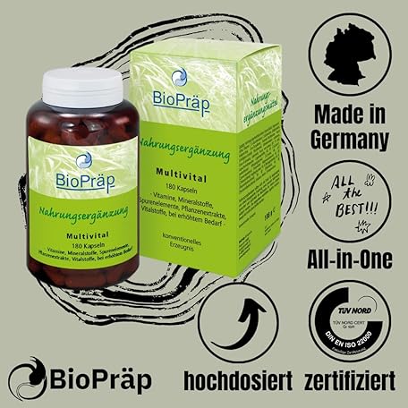 Thương hiệu BioPräp Biologische Präparate Handelsgesellschaft mbH là cái tên nổi tiếng được rất nhiều khách hàng trên thế giới chọn lựa. Với kiểu dáng đẹp mắt, sang trọng, sản phẩm BioPräp Multivital Kapseln | 180 Zellulose-Kapseln | Multivitamin A-Z Komplex hochdosiert mit Mineralstoffen und Vitalstoffen | produziert in Deutschland | zertifizierte Produktion là sự lựa chọn hoàn hảo nếu bạn đang tìm mua một món cho riêng mình.