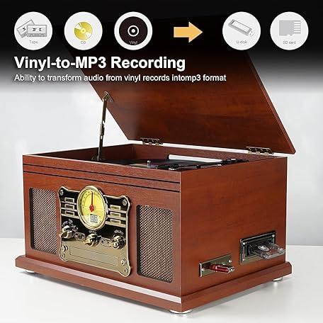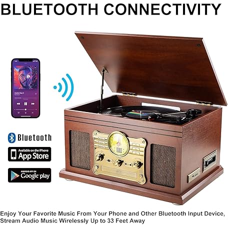 Thông tin sản phẩm Bluetooth Turntable with Stereo Speakers, Support Vinyl to MP3 Recording Converter with CD, Cassette Player, FM, Aux-In and Headphone Jacks