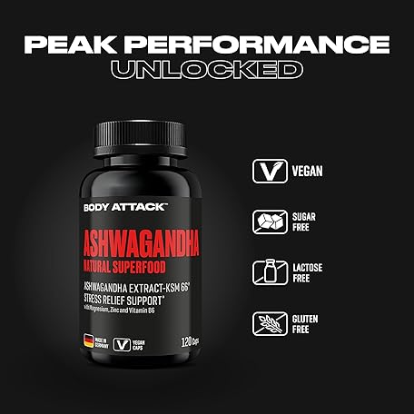 Sản phẩm Body Attack Ashwagandha KSM-66® Capsules, Pack of 120, Indian Sleep Berry, Capsules with High Dose Ashwagandha, Made in Germany, with Magnesium, Zinc & Vitamin B6, Vegan đang được bán với giá ưu đãi là $24.0999 tại nước Đức.
