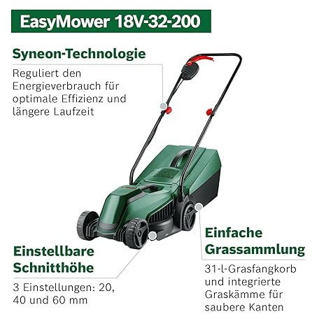 Thông tin sản phẩm Bosch EasyMower 18V-32-200 Cordless Lawnmower (1 x 4.0 Ah Battery, 18 V System, Cutting Circle Diameter: 32 cm, in Box)