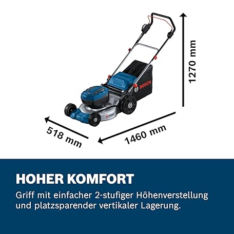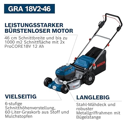 Thông tin sản phẩm Bosch Professional 18V System GRA 18V2-46 Cordless Lawnmower (Cutting Width: 46 cm, 6-Level Height Adjustment, 60 Litre Textile Grass Catcher Basket, Includes 2 x Insulation Keys, Mulchers)