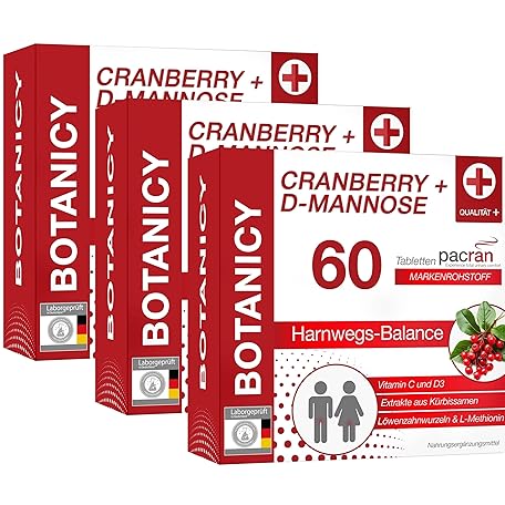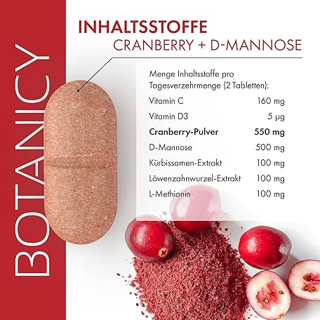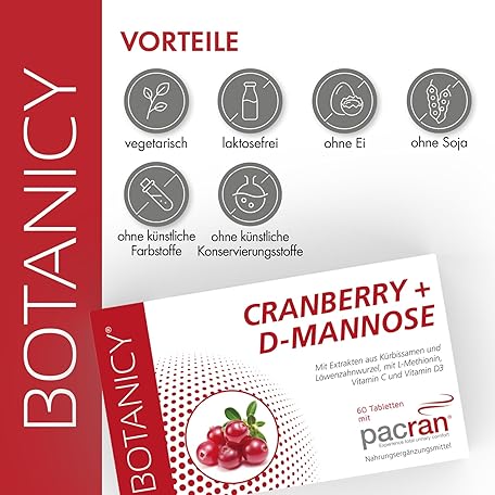 Sản phẩm BOTANICY Cranberry + D-Mannose - 180 Tablets - Supports Bladder & Urinary Tract - Pacran® Cranberry Powder, Vitamin C and D3, Pumpkin Seed & Dandelion Root Extract đang được bán với giá ưu đãi là $57.2686 tại nước Đức.