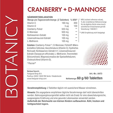 Thông tin sản phẩm BOTANICY Cranberry + D-Mannose - 180 Tablets - Supports Bladder & Urinary Tract - Pacran® Cranberry Powder, Vitamin C and D3, Pumpkin Seed & Dandelion Root Extract