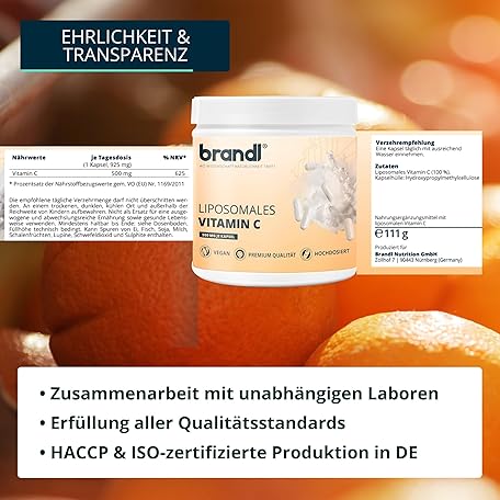 Sản phẩm Brandl® Liposomal Vitamin C High Dosage, Natural & No Additives, Vitamin C 500 mg per Capsule, Pack of 120 đang được bán với giá ưu đãi là $38.15 tại nước Đức.